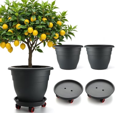 large, heavy-duty pots with drainage and movable trays, making them ideal for container fruit trees and tall plants. The rolling saucers make it easy to reposition plants for better sunlight or move them indoors/outdoors without lifting heavy pots.