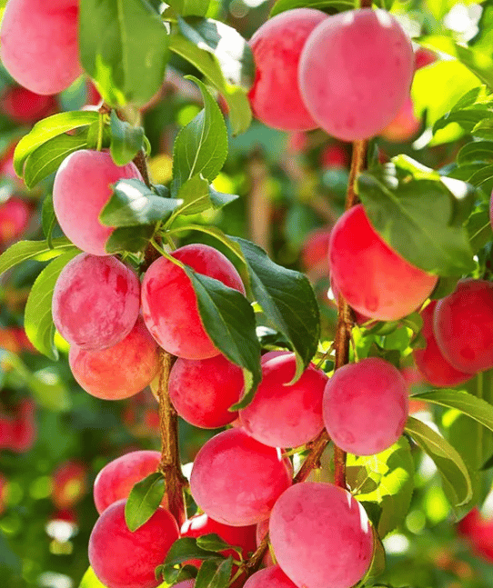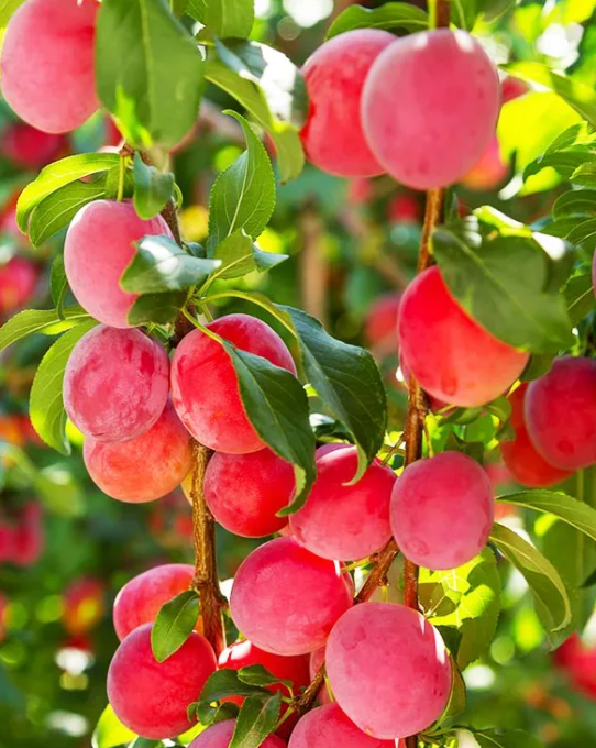 The Fruit: A visual showstopper! Featuring both cherry-red skin and deep red flesh, this plum is bursting with antioxidant-rich, sweet juice. (Zones 5-9).